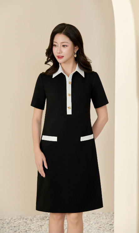 Váy Dera thiết kế dáng suông phối cổ viền trắng cúc đồng tối giản